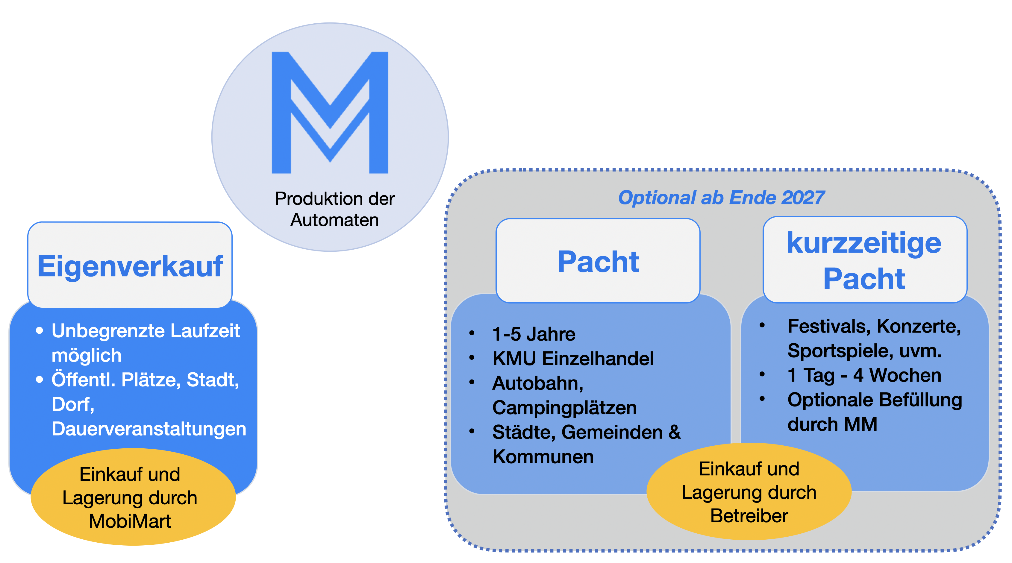 Einerseits werden die MobiMart Automaten an Dritte verpachtet. Zum Anderen werden die Automaten im Eigenverkauf betrieben. Der Betreiber ist für die Bestückung und den Verkauf verantwortlich. Über die App laufen beide Konzepte nach demselben Prinzip der Ortung, Bestellung und Bezahlung.